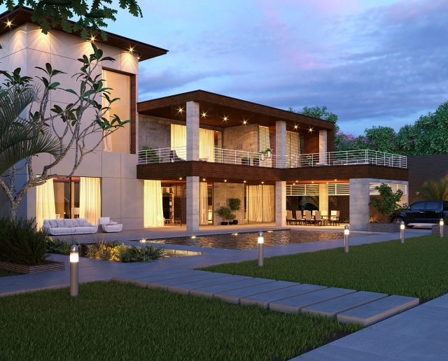リゾート風外構は、ライトアップをすることで夜間さらに魅力的になります。