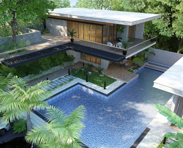 プールや噴水などを設置したり、ヤシの木など熱帯地域の植栽を採用することで、常夏の明るい雰囲気を演出します。